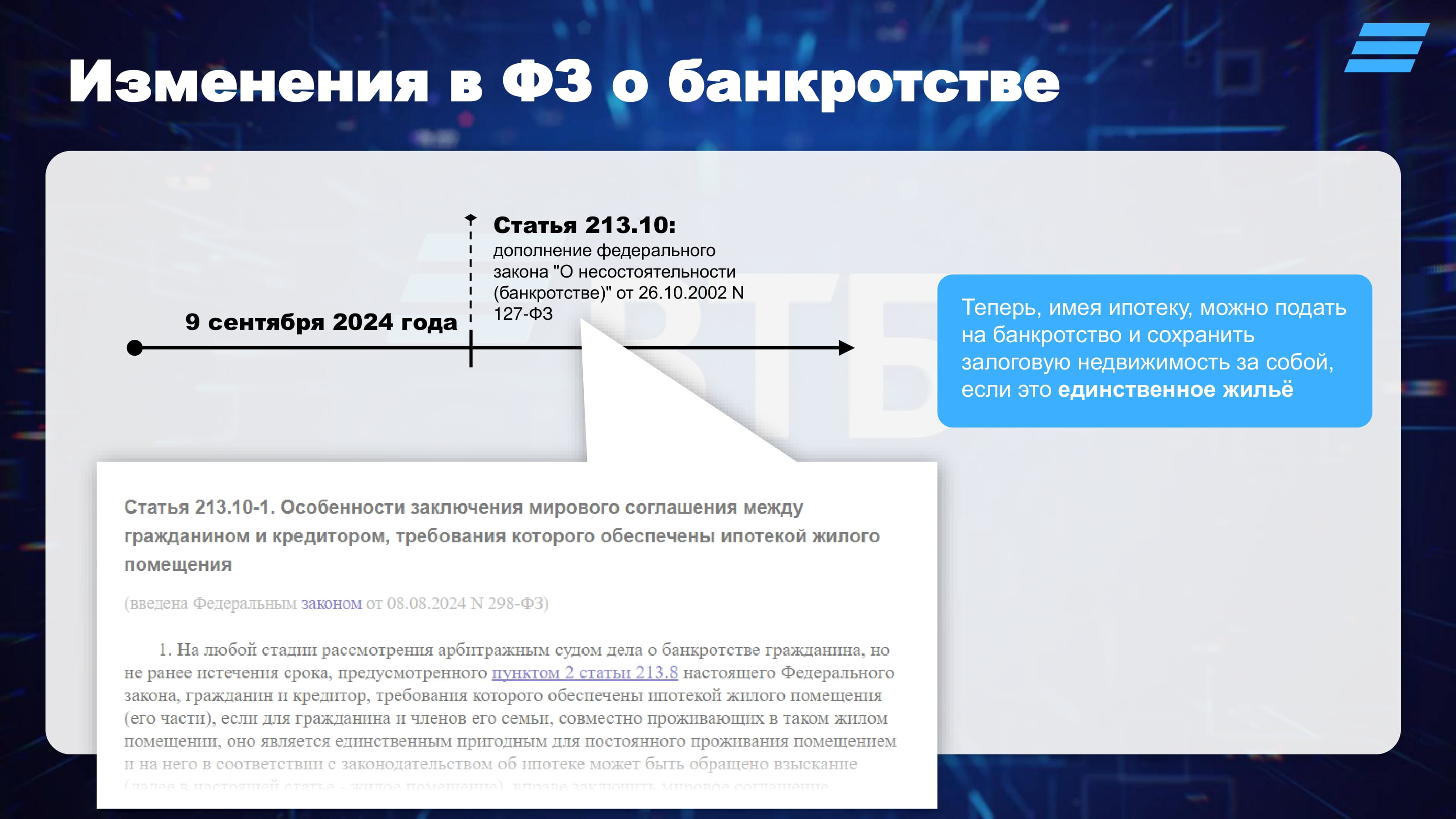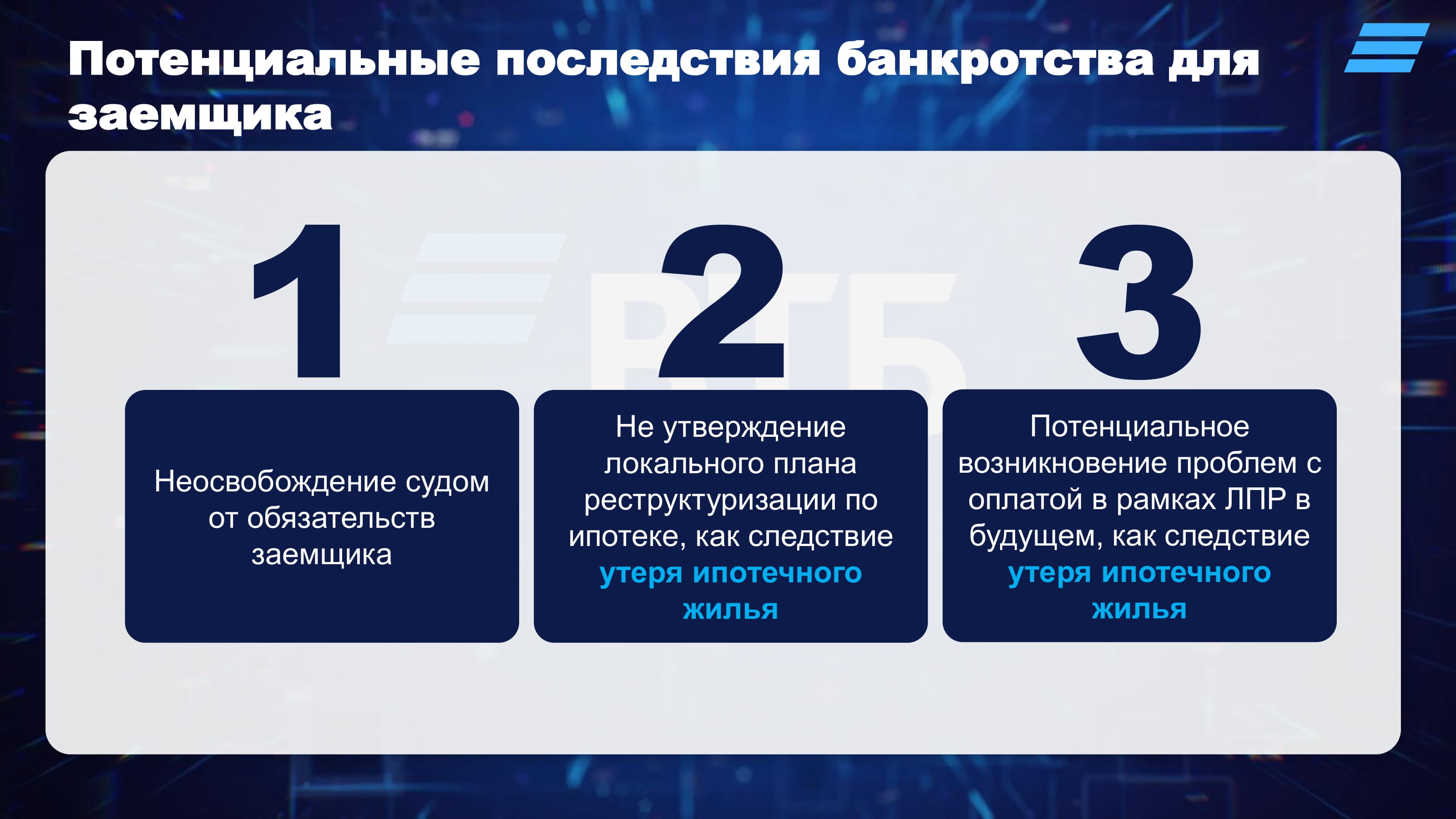Во второй половине 2024 года были внесены изменения в ФЗ о банкротстве – теперь, имея ипотеку, заемщик-ФЛ может подать на банкротство и сохранить залоговую недвижимость за собой, если это единственное жильё. За кажущимися, на первый взгляд, несомненными преимуществами для заемщика, указанные изменения несут высокие риски для него. Помимо очевидных негативных последствий банкротства, это риски потери жилья. Причины: во-первых, после инициации банкротства суд не всегда выделяет ипотеку в отдельное производство, во-вторых, заемщик не застрахован от потенциальных проблем в будущем, но воспользоваться повторно процедурой уже не получится.