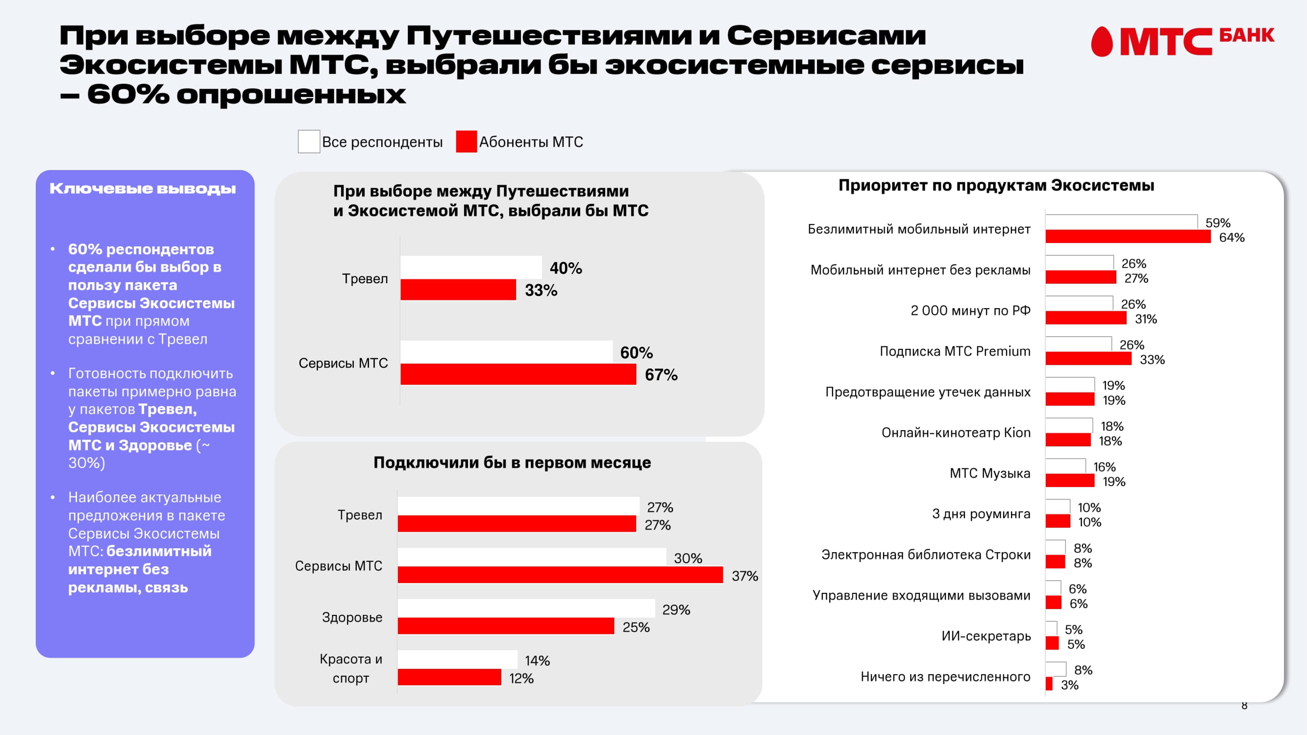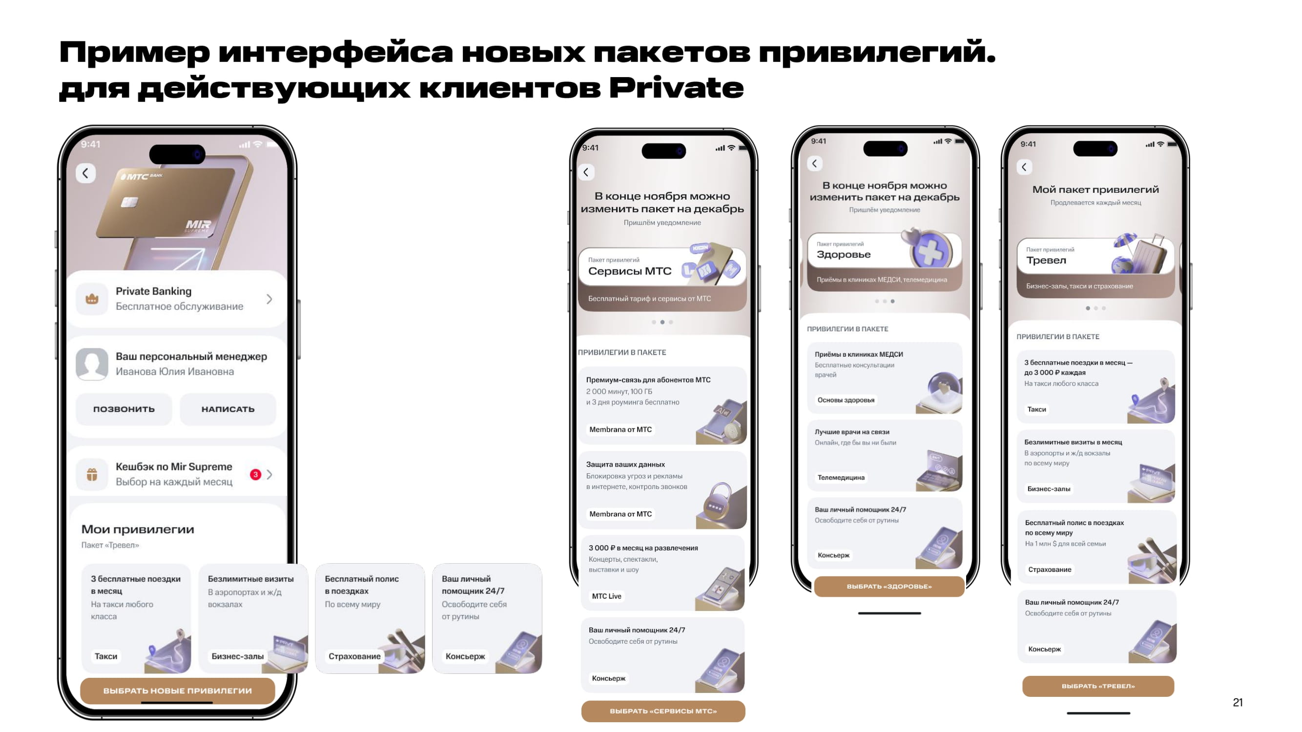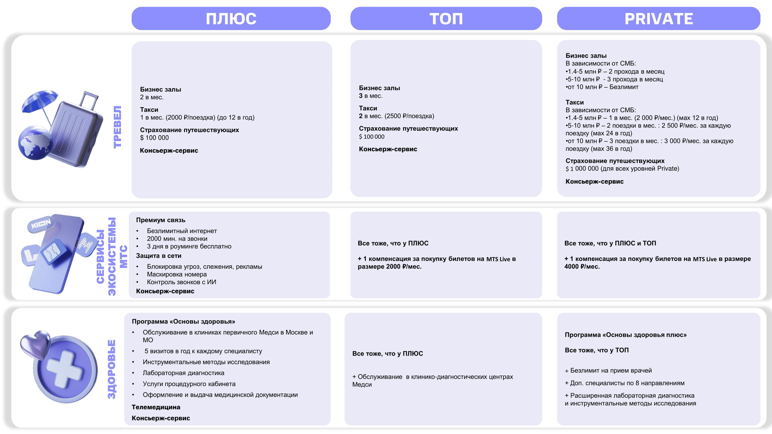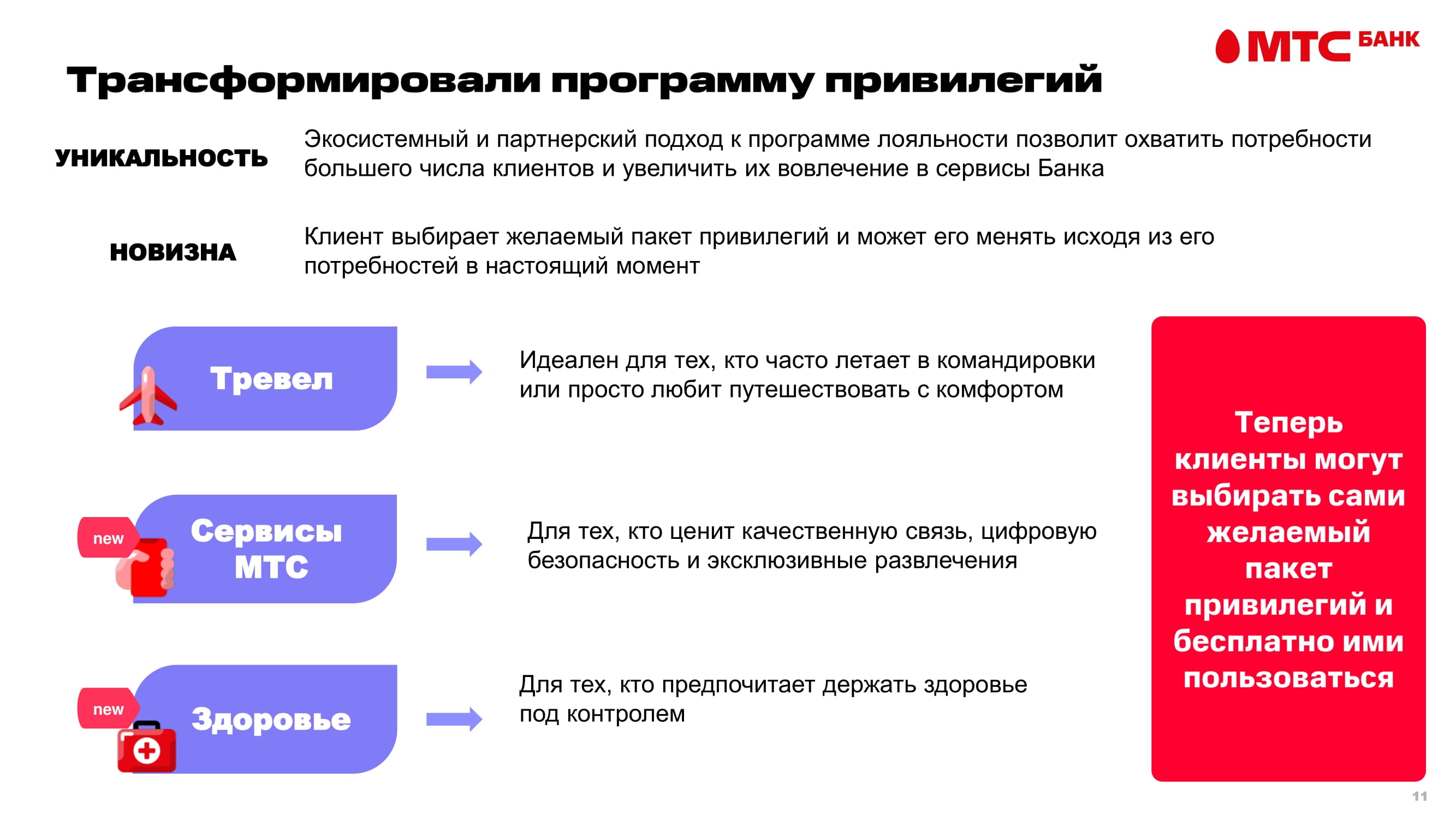 Вместо разрозненных бонусов мы создали три целостных пакета, отражающих реальные потребности клиентов: «Тревел», «Здоровье» и «Сервисы МТС».