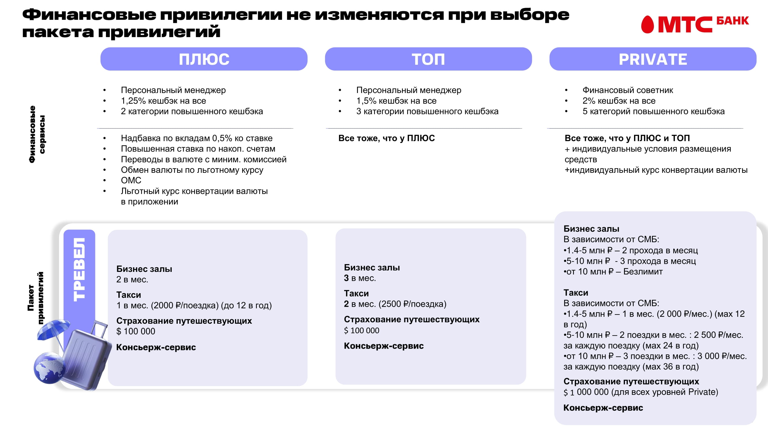 «Тревел»: привычные бизнес-залы, страховка на $100 000 и консьерж-сервис дополнены компенсацией такси (до 2 500 ₽), а количество бесплатных проходов в бизнес-залы увеличено.