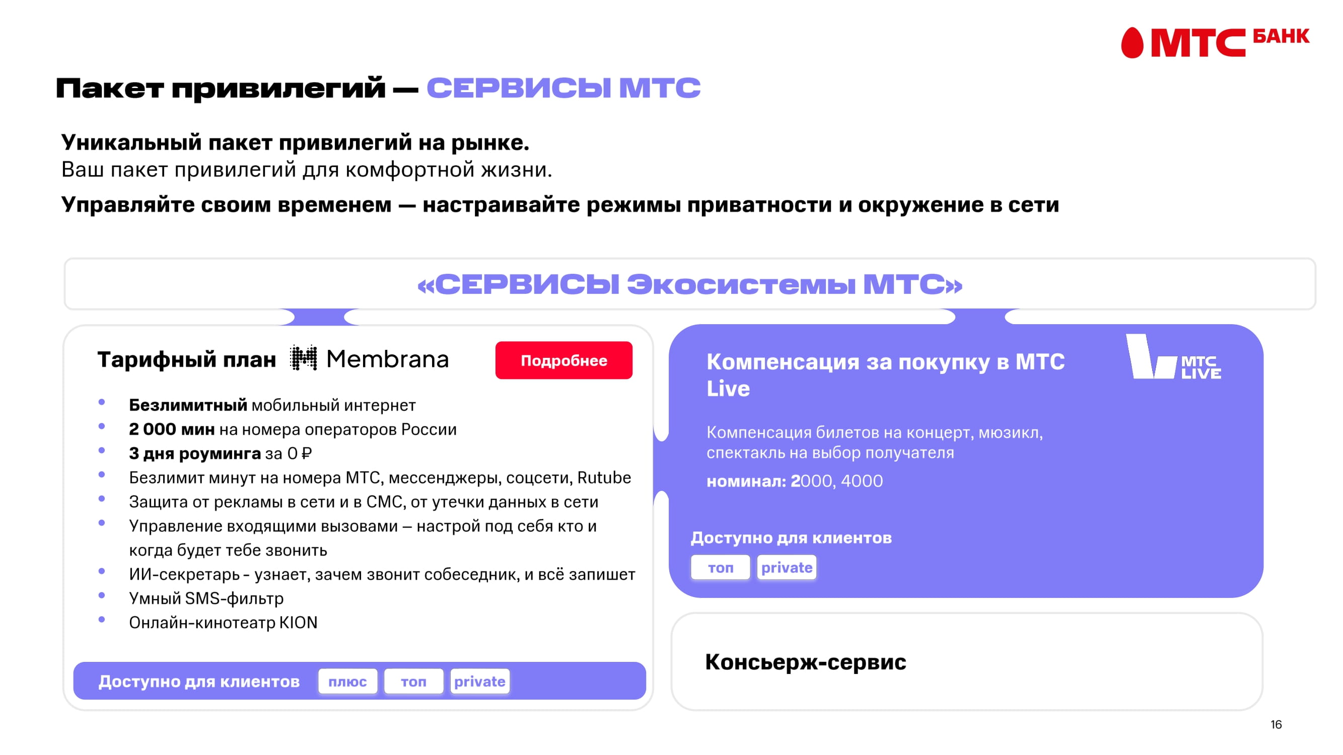 «Сервисы МТС»: премиальный тариф Membrana с 100 ГБ интернета, 2 000 минутами связи и роумингом, защита звонков на базе ИИ и компенсация билетов на концерты МТС Live для клиентов уровня «Топ».