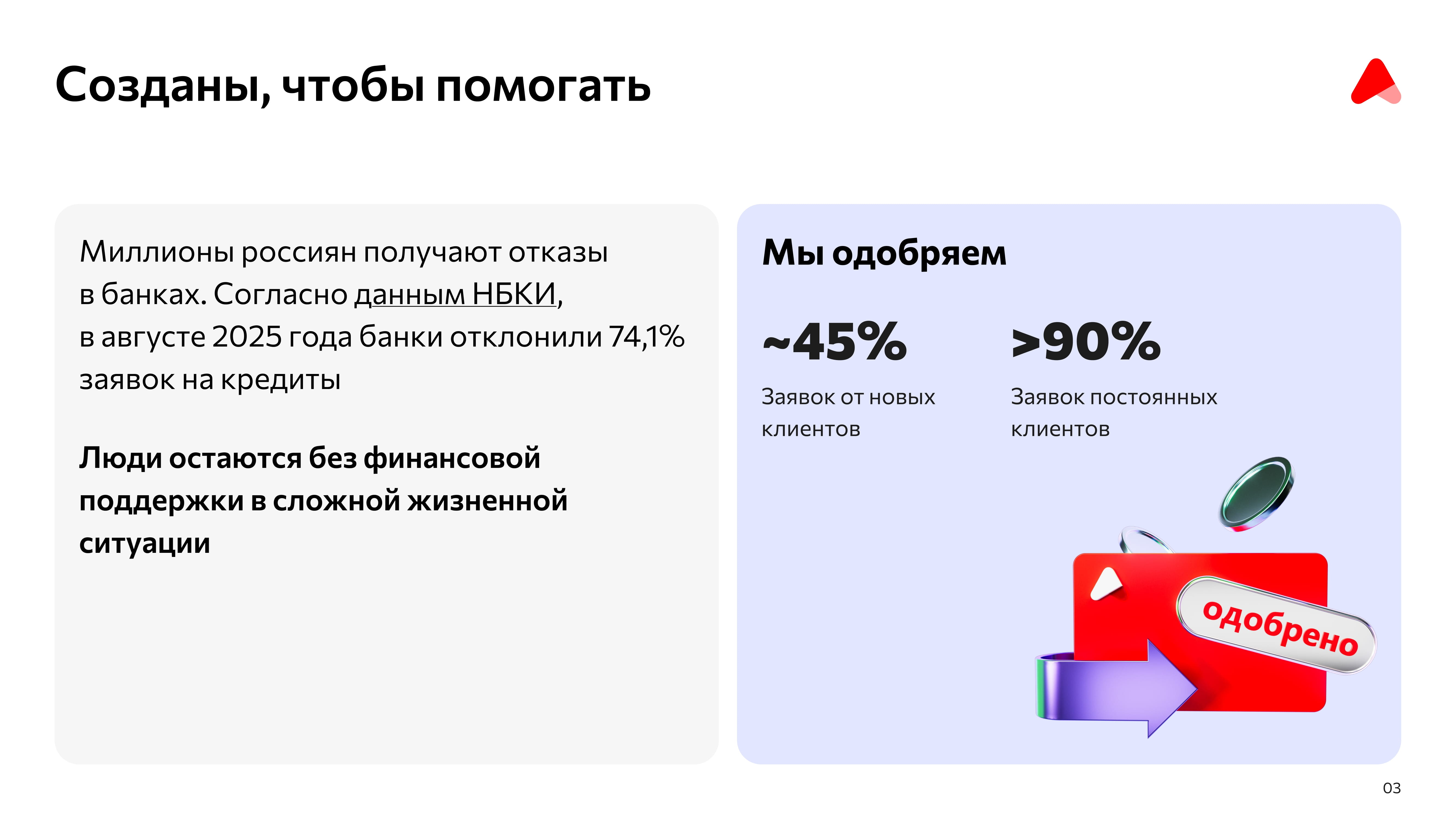 - Уровень одобрения заявок: ~45% для новых клиентов и >90% для постоянных.