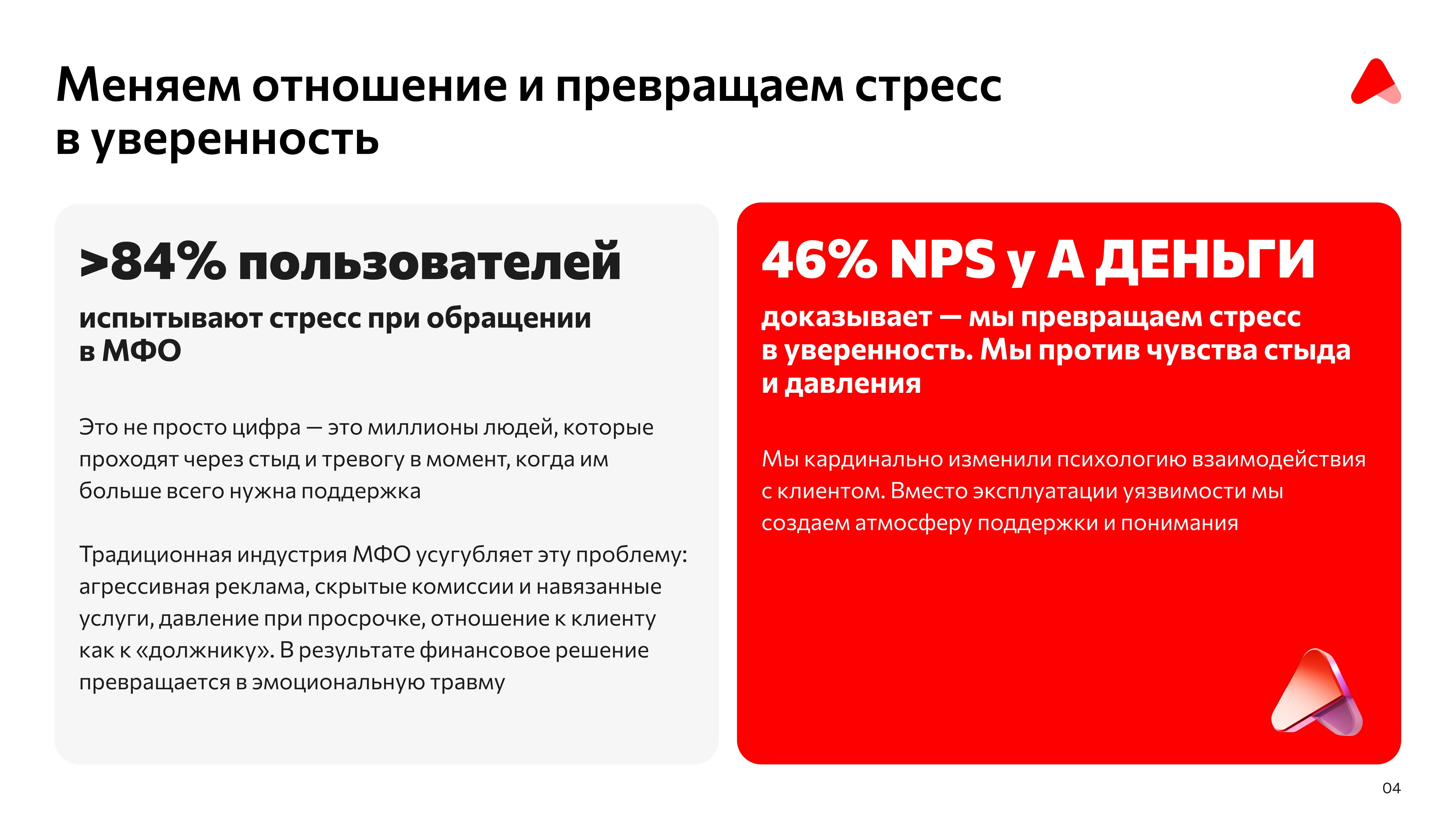 А ДЕНЬГИ — это финтех нового поколения, создающий сервис банковского уровня на рынке микрокредитования. Проект бросает вызов традиционной модели МФО, которая часто эксплуатирует уязвимость клиентов, и предлагает ей альтернативу, построенную на этике, технологиях и клиентоориентированном подходе