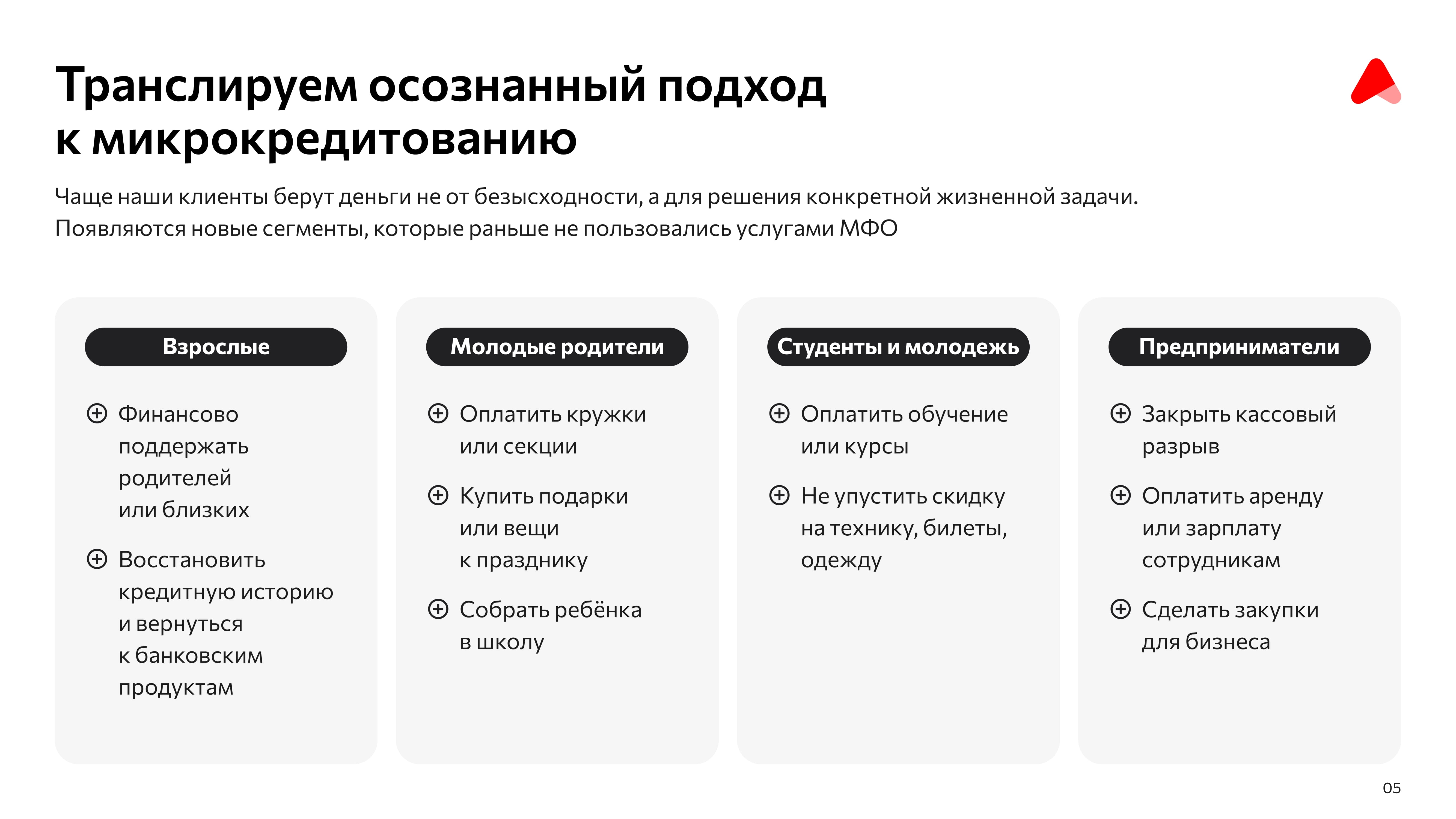 - Привлечены новые сегменты клиентов (молодые родители, студенты, предприниматели), которые раньше не рассматривали МФО как инструмент для решения жизненных задач.