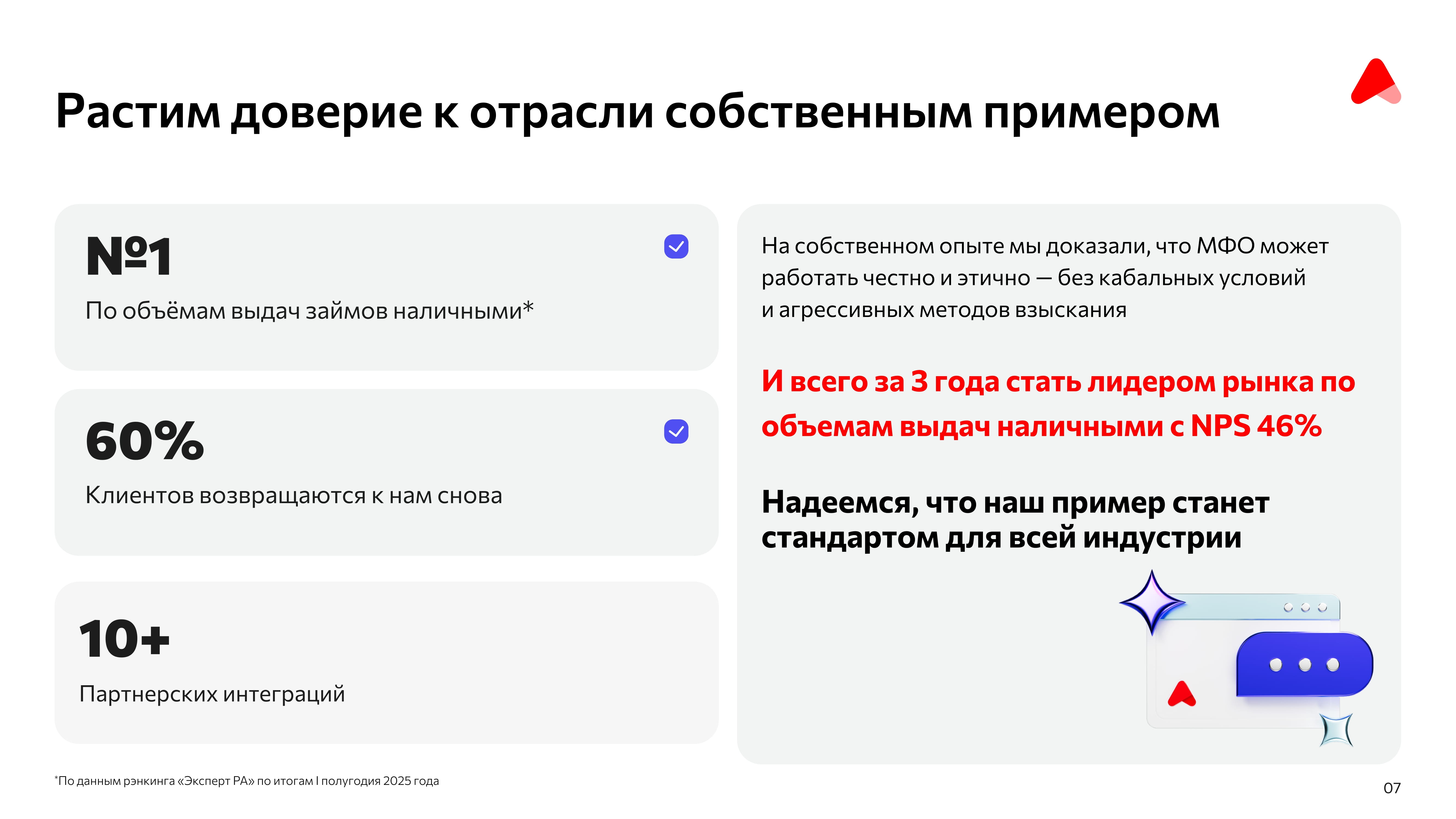 - Для индустрии: Компания намерена и дальше повышать стандарты прозрачности и этичности, способствуя «обелению» всего рынка МФО и росту доверия к нему