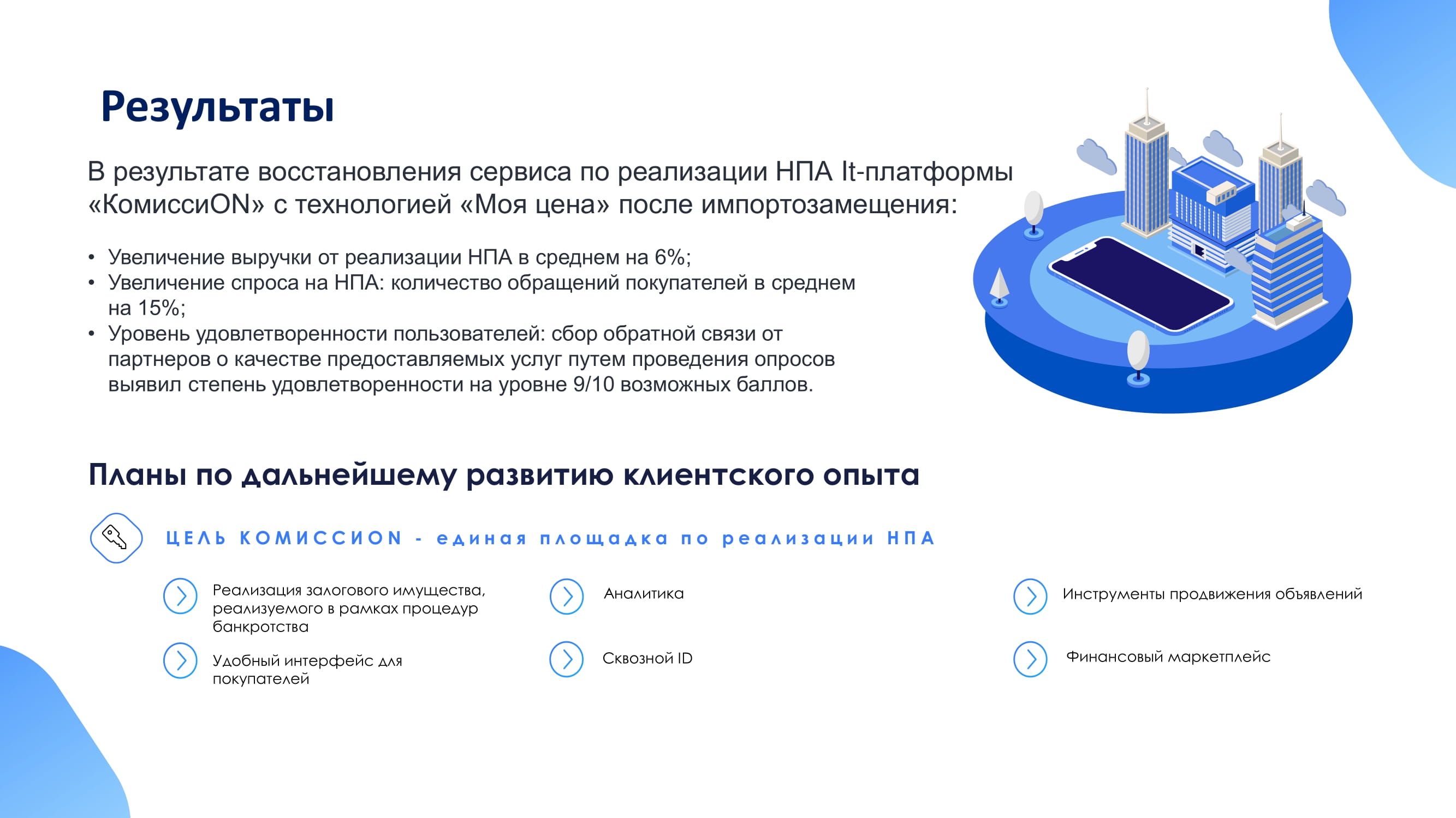 Мы усовершенствовали сервис на импортозамещенной IT-платформе КомиссиON, которая позволяет клиентам при покупке непрофильных активов в режиме онлайн делать ставки по интересующему объекту. При наличии нескольких интересантов система определяет победителя, предложившего бОльшую цену.